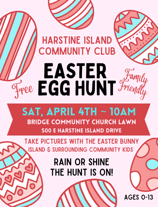 Bring the kiddos for a fabulous, family-friendly morning of egg-hunting fun for ages 0–13 – plus photos with the Easter Bunny. Open to Harstine Island and surrounding community families. And yes… rain or shine, the hunt is on! ☔✨